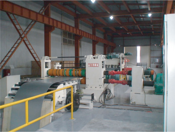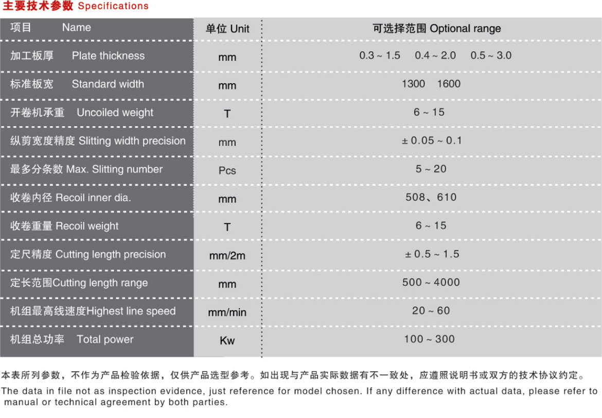 本設備用于不銹鋼、鍍鋅板、冷軋板卷料的開卷、校平、剪切、收卷作業,自動程度高、生產效率高。全線電氣控制整機聯動,加工精度高。整條生產線機械、電氣、液壓、氣動自動化控制一體化,從開卷、校平、縱剪、橫剪、收卷實行同步控制。整套設備考慮到所加工材料的表面要求較高,設計的各種過橋托輥輸送裝置,表面采用特殊工藝,不會造成板料壓痕、碰傷、劃傷、劃傷、折邊、咬邊等現象。