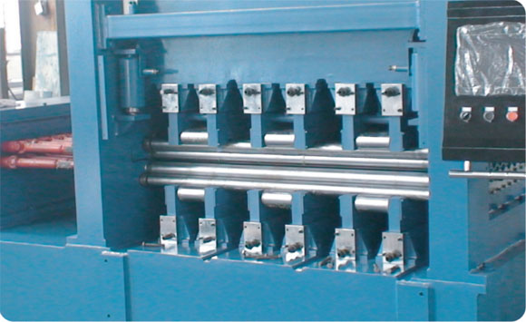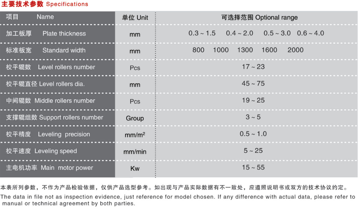 本機床是四重式校平機的升級機型。在上、下排校平工作輥與支撐輥(輪)之間各加裝進一排中間輥,構成上下各三重,共六重的組輥結構。通過中間輥的過渡,支撐輥(輪)的支撐力不直接作用于工作輥,避免了四重式校平機工作時,在敏感材料表面留下支撐輥(輪)壓痕的現象,最大程度地保護加工材料的表面狀態。主要用于校平鋁板、不銹鋼板、銅板、有色金屬板、不同金屬復合板,涂、鍍、磨工藝金屬板等對板表面要求較高的板材。校平輥受力分布均勻,結構剛性好,工作輥繞曲變形小,校平精度高。